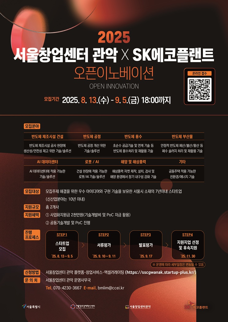 [서울창업센터 관악] 2025년 서울창업센터 관악×SK에코플랜트 반도체·AI·로봇 분야 오픈이노베이션 참여기업 모집(~9/5, 18시)
