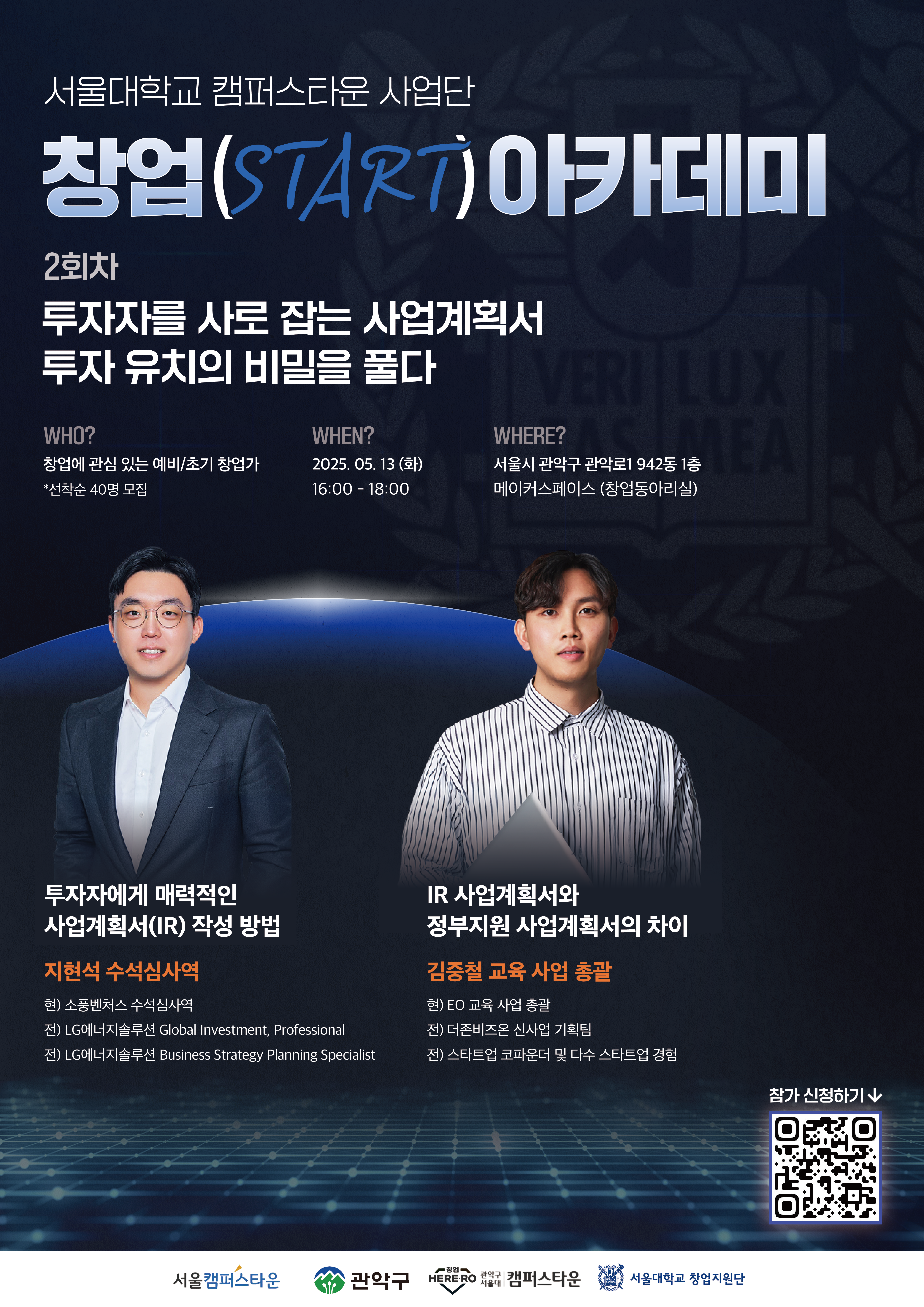 2025 서울대학교 캠퍼스타운 사업단 ‘창업 Start 아카데미’ 교육생 모집 (2회차) “투자자를 사로잡는 사업계획서 : 투자 유치의 비밀을 풀다”